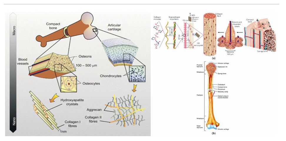 Physiology of bone: hierarchical structure and mechanics: Bone is a specialized connective tissue that provides mechanical support, hematopoiesis, mineral homeostasis, and organ protection through a hierarchical architecture spanning nanoscale collagen–hydroxyapatite composites to macroscopic anatomical structures.13 Type I collagen fibrils mineralized with hydroxyapatite impart tensile and compressive strength at the nanoscale, while their assembly into lamellae, osteons (cortical bone), and trabeculae (cancellous bone) generates anisotropic mechanics suited to diverse loading conditions.14,15 Cortical bone comprises ~80% of skeletal mass and confers rigidity, while cancellous bone supports metabolic activity; together they enable high load-bearing with dynamic remodeling.16–18 Figure 1 illustrates the multiscale architecture underlying bone’s dual roles of strength and regeneration.14