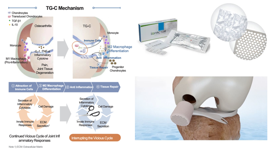 Gene-enhanced platforms: TissueGene-C (Kolon TissueGene) combines allogeneic chondrocytes with TGF-β1 for osteoarthritis repair. In Phase III trials in Asia, it promotes immune cell recruitment, M2 macrophage polarization, and coupled cartilage–bone remodeling.108