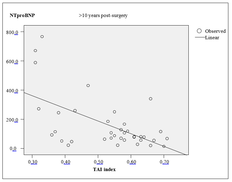 Our findings align with studies by Valente et al.,1 and Geva et al,2 confirming the progressive loss of sensitivity of NT-proBNP in detecting RV dysfunction beyond the first decade after surgery. This may reflect compensatory mechanisms or myocardial remodeling. In early follow-up, NT-proBNP correlates well with TTE indices such as TAPSE and RV FAC, in agreement with ESC guidelines on adult congenital heart disease follow-up. Notably, TAI index remains associated with NT-proBNP even in the late period, suggesting its sensitivity to subclinical dysfunction. Similar trends were observed in studies evaluating late postoperative follow-up after tetralogy of Fallot repair.3-5