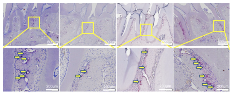 Figure 1 PBS, EXO, and health, PD comparison of osteoclast quantity (stained red) between first and second molars.2