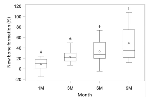 Figure 5 Clinical assessment of new bone formation. The new bone formation rate was measured using X-ray images at 1 month, 3 months, 6 months, and 9 months (n = 12).