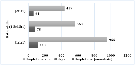 For reducing droplet size of neem oil, sonication time was found more helpful than surfactant concentration as it can be seen from Table 1. On increasing sonication time from 45min to 60min for the similar neem oil, surfactant ratio gives approximately two times neem oil droplet size reduction, on the other hand on increasing surfactant concentration from 1:0.5 to 1:3 for 45min sonication time resulting in droplet size reduction with the ratio 2, while for 60min sonication time decrease in droplet size was in the ratio 1.9.