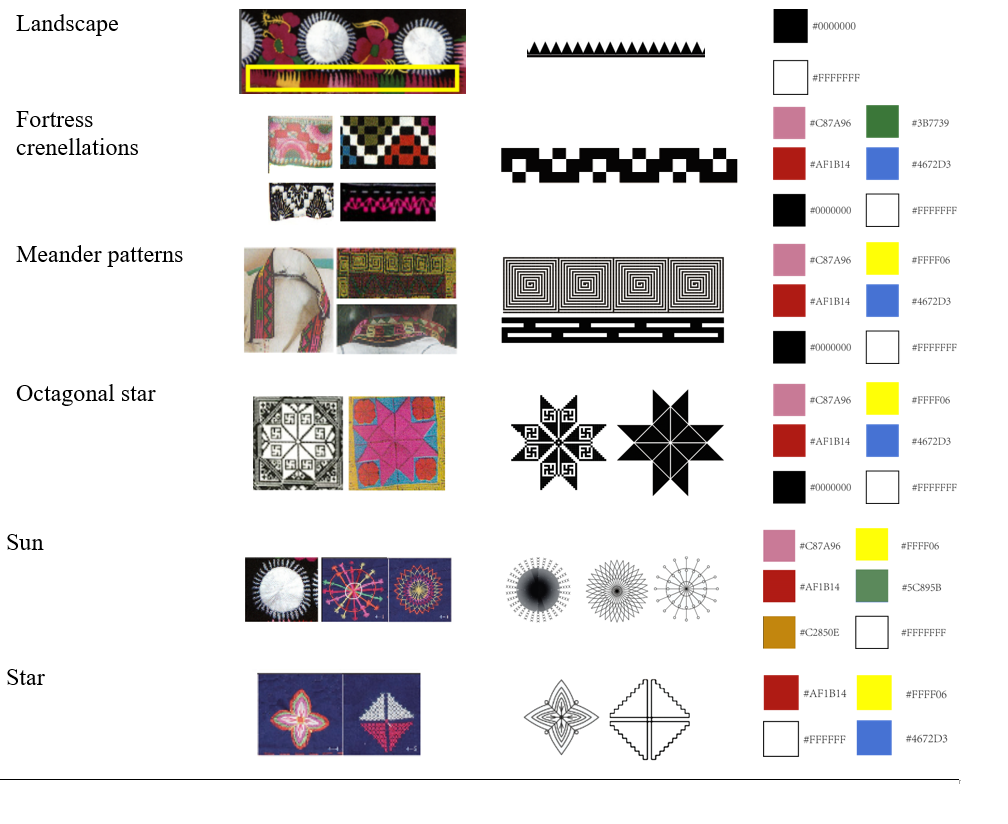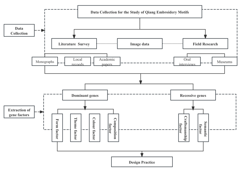 Regarding the criteria for identifying cultural genes, several papers have mentioned that it is similar to those for identifying biological genes, which include "dominant genes" and "recessive genes".8,11–13 Both are alleles that determine the expression of relative traits in their offspring. Dominant cultural genes are highly visible, which can be directly perceived, such as motifs’ theme, forms, colors, and compositions—while recessive cultural genes are generally more subtle and not easily perceived, encompass intangible elements embedded in historical, social, and economic contexts, such as craftsmanship techniques and semantic symbolism, etc.14,15 Extracting dominant cultural factors facilitates the design of culturally resonant creative products, whereas decoding recessive cultural factors ensures the accurate transmission of ethnic values and enriches the cultural depth of design practices.16 These theoretical studies have corresponding practical arguments, which can provide theoretical references for the cultural gene extraction and design translation of Qiang embroidery motifs.