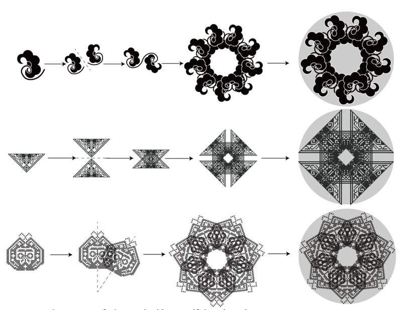 Three traditional Qiang embroidery motifs—ram's horn flowers, butterflies, and pomegranates (Figure 3)—were selected as primitive forms. Using shape grammar, innovative motifs were generated through iterative copied, rotational and mirrored transformations. These motifs were subsequently organized within a circular adaptive framework, characteristic of Qiang embroidery, to create new motifs. The designs retain the distinctive aesthetic of Qiang embroidery while integrating classical composition, endowing the new motifs with symbolic connotations of harmony and completeness.
