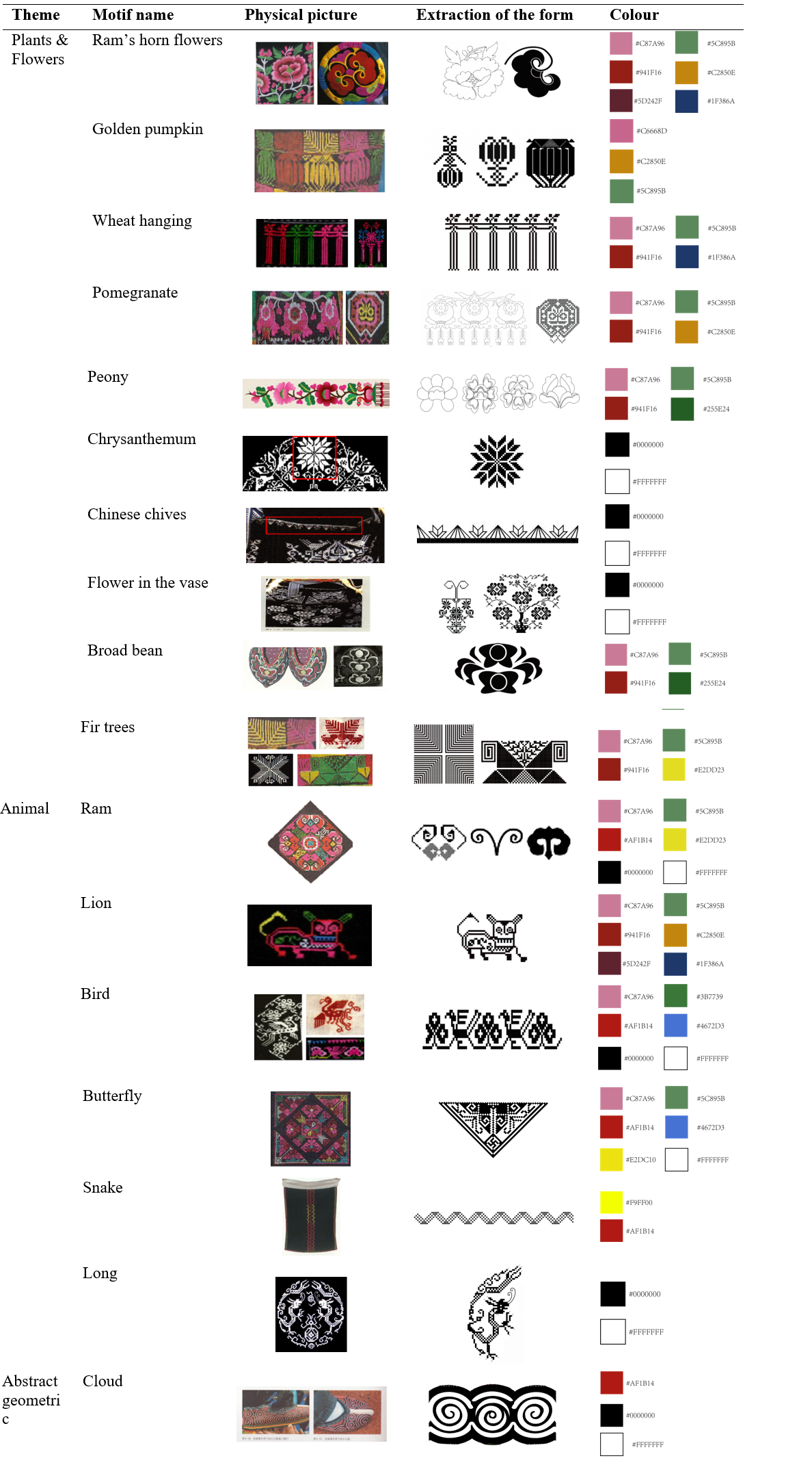 Influenced by their natural environment, cultural heritage and historical evolution, Qiang embroidery exhibits a rich diversity of motifs. Based on systematic categorization of patterns from the Qiang embroidery motif database, these motifs can be classified into four categories: