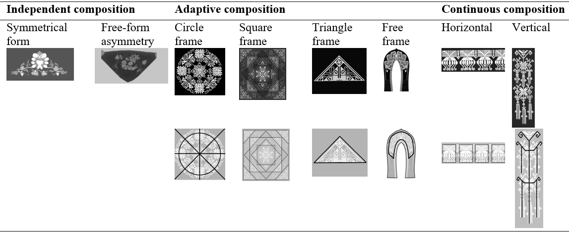 Through skeletal analysis of Qiang embroidery motif derived from historical records, archival texts and field research imagery, three primary compositional principles emerge (Table 2): independent, adaptive and continuous composition.