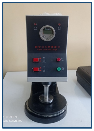 To determine the thickness of nonwoven fabric obtained from natural silk waste, a 10 x 10 cm sample was cut from different skeins of nonwoven fabric based on the requirements of the GOST 6943.18-94 (ISO 4603-78) (ISO 9073-2) standard and the fabric sample, which was stored in accordance with the ISO139 standard (temperature 20 ± 2 °C and relative humidity 65 ± 2%) for 24 hours, was measured using a thickness gauge YG141. was put into the equipment.