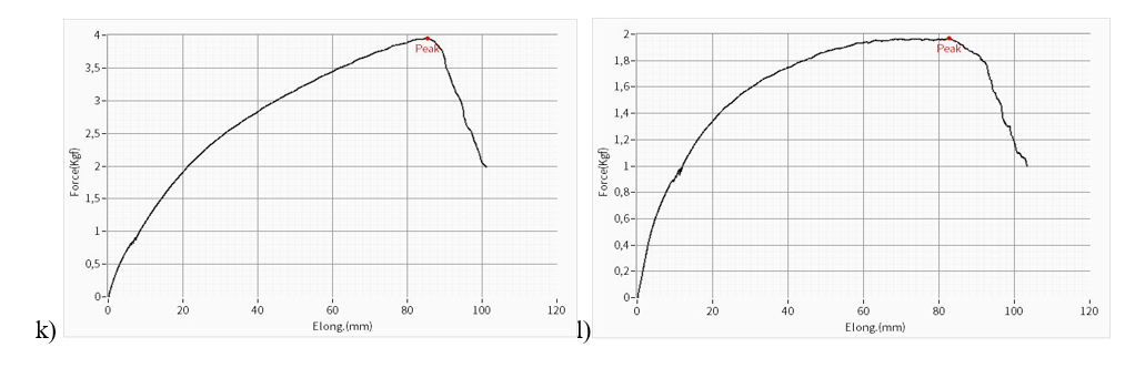 Figure 7 k) Average tensile strength and elongation at break of the experimental results obtained for the width of the H5 nonwoven fabric, l) width of the nonwoven fabric.