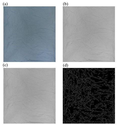 The value defined for the σ was 12, according to visual tests where it was determined when an inner edge was no longer detected or, at the other end, when false edges were detected. Values less than 12 were responsible for false edge detection, whereas edges were neglected in detection above this value. In a single-color substrate, the existing color gradients correspond to the wrinkles. In this step, these gradients are identified as the inner edges of the image, corresponding to the fabric's wrinkles. They are characterized by a change in the gray level when there is a discontinuity in intensity or when the image gradient has a sudden variation.32,33 In this way, the Canny edge detection operator transforms the grayscale image, previously filtered, into a black image with the inner edges in white, showing where the fabric wrinkles are arranged.