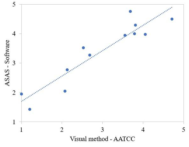 Figure 3 Correlation between the smoothness levels of the ASAS (by software) and the AATCC visual method.