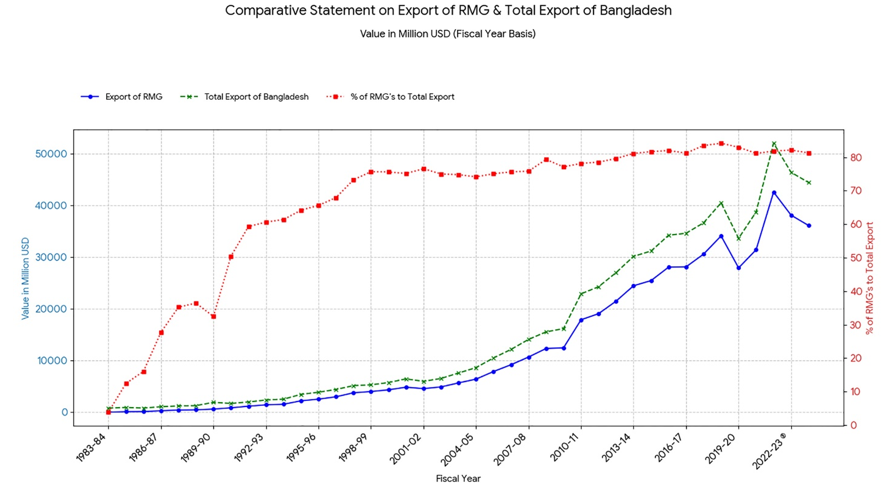 The Ready-Made Garments (RMG) industry is the backbone of Bangladesh’s economy, contributing over 81.29% in the year of 2023/2024 and 84.21% in year of 2018-19 the country’s total exports and providing employment to more than four million people.1 Within this sector, knit basics such as T-shirts, tank tops, undergarments, leggings, lightweight sweaters, and loungewear form a significant segment, offering both domestic and international market opportunities. The industry’s rapid growth over the past decades has positioned Bangladesh as a global leader in knitwear exports, with the knitwear segment alone adding up to 19282.15 million USD in the year of 2023-2024 whereas total export Bangladesh's Apparel Export to World 36151.31 Million USD.1 Figure 1 the blue line & Dots illustrates the export value of Ready-Made Garments (RMG) sector from Bangladesh, reflecting a regular rising trend over the years. The green line and cross represents the total export earnings of the country, covering all sectors. The red dotted line and squares shown the percentage share of RMG in total exports, emphasizing the sector’s dominant role in Bangladesh’s export economy.