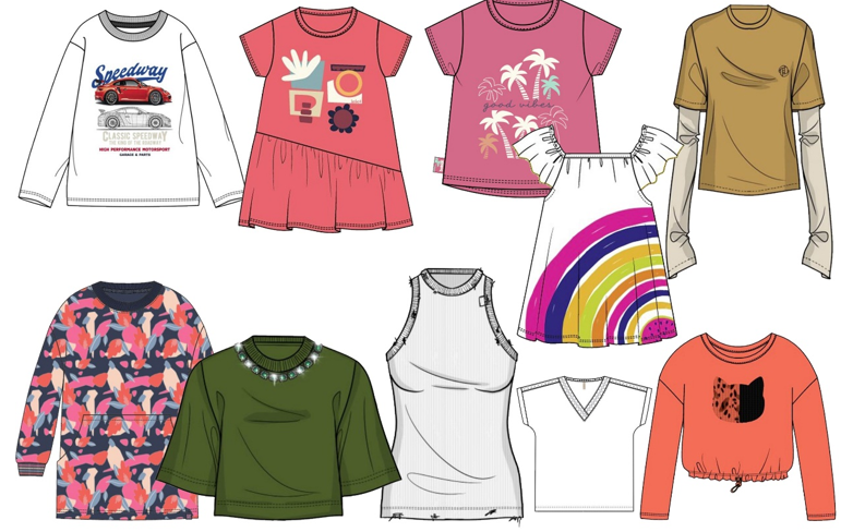 The Ready-Made Garments (RMG) industry is a cornerstone of Bangladesh’s economy, contributing more than 81.29% to export revenues and employing millions, with a significant proportion being women.1 Bangladesh’s knitwear sector or knit basics, particularly in essential items like different kind of T-shirts, tank tops, and leggings, dresses and under garments has experienced exceptional growth driven by production efficiency and rising global demand for knitwear’s. Figures 2–5 depicts a collection of knit basics flat sketches showcasing a variety of knits basics/garments including tank tops, t-shirts, sweatshirts, leggings, jackets, knit dresses, under garments and shorts.
