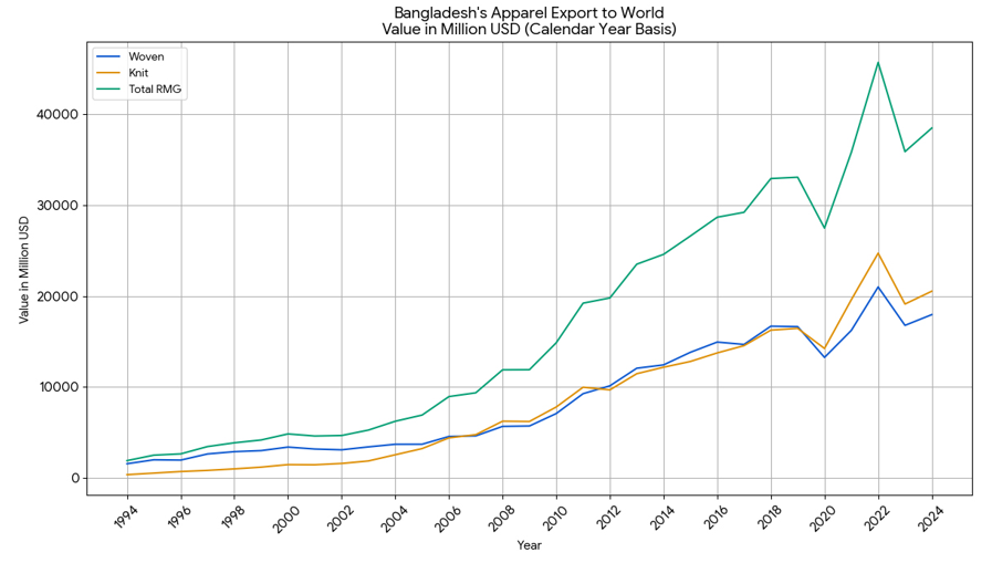 Knit garments now serve as a vital segment of both domestic and international apparel markets. According to BKMEA, knitwear exports increased from US$12.05 billion in FY 2013–14 to US$25.74 billion in FY 2022–23, with an average annual growth rate of 10.23%. Figure 6 Bangladesh’s Apparel Export to the World, illustrates the export value of ready-made garments into two segments; woven garments (blue line) and knit garments (orange line) as well as total RMG (green line indicates the total export value calculated by adding the values of woven and knit garments). The data set is in million USD and follows the calendar year from 1993 to 2024. Knitwear has started to close the gap with woven garments since 2010 and in fact exceeded them in a couple of years, like 2021 and 2022. This trend reflects not only the growing world demand for knitwear but also it is shows a growing of production and efficiency of the knit sector. Over the last three decades the export of RMG from Bangladesh has exponentially grown, particularly knit garments that at some points has even exceeded the export value of woven garments.