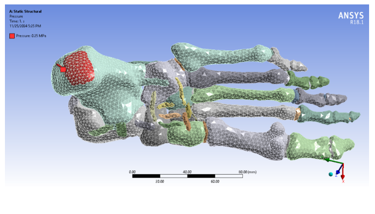 A 3D model of the human foot bones was previously reconstructed from medical imaging data and prepared for finite element analysis in ANSYS Workbench. The model included cortical and trabecular bone regions segmented from CT datasets, smoothed and meshed with tetrahedral elements to ensure adequate convergence and stability of the solution. Mesh quality was verified through element aspect ratio and orthogonality criteria to minimize numerical error.