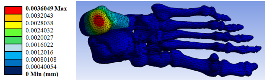 These values demonstrate that although the displacements are small, the stress magnitudes are significant given the repetitive nature of gait cycles. Figures 2 and 3 illustrate the displacement field and Von Mises distribution, respectively.