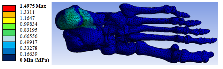 The finite element simulation of heel-strike confirmed the mechanical sensitivity of the foot during the first contact phase of gait. Stress peaks at the calcaneus highlight the importance of cushioning and footwear design for impact mitigation. This methodological approach will serve as the basis for extending the analysis to later stance phases and for integrating subject-specific experimental gait data.