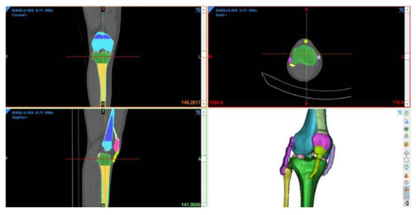 Bio-models are generated from superimposed images using specialized computer programs.6 The main basis is to carry out studies involving imaging tools, in this case using computed tomography (CT).7,8 After getting the images to build the three-dimensional model, there is a segmentation procedure9 that is made from the model, thereby separating the components that give structure to the knee. During the segmentation process, carried out in Materialise Mimics, the different masks are separated according to the number of elements with which one wishes to work, thus differentiating the elements and creating distinct bodies (Figure 1).