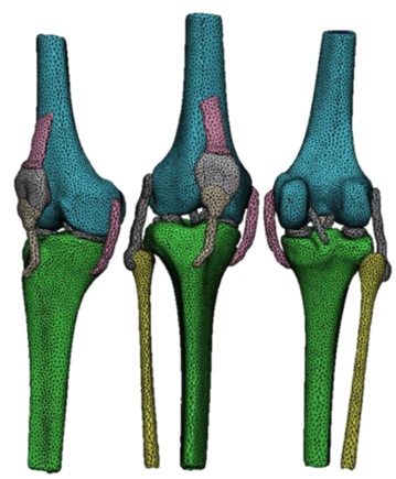 The importance of modeling the knee for a three-dimensional analysis is that is easier to understand the behavior of the complex structure, observing graphically where the stresses are acting during certain movement just with the application of the mechanical properties and the external load that simulates the walk, the couch and any other activity one wants to analyze.