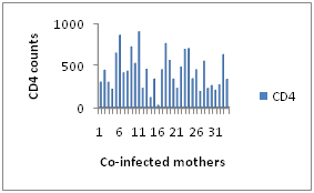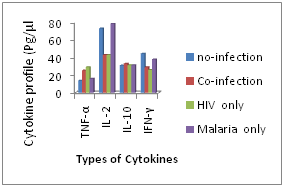 Saki; (Latitudes 8o 26' and 9o 5' North and Longitudes 2o 45' and 3o 37' East) known for its seroprevalence and co-infection in Oyo State, Nigeria. 149 pregnant mothers screened of HIV and P. falciparum after due informed consent and ethical approval by UI/UCH Ethical Committee and 30 babies born to sero-positive mothers were enrolled and followed-up post-partum. Blood samples (5mL) collected were screened for the presence of malaria parasites. Patients’ CD4+ counts and plasma concentration of (TNF-α, IL-2, IL-10 and IFN-γ) were determined by FACS and ELISA techniques respectively Data obtained were analyzed using Student t-test and ANOVA.