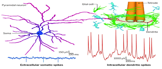"Dendrites receive inputs from other neurons, and the electrical activity of dendrites determines synaptic connectivity, neural computations, and learning. The prevailing belief has been that dendrites are passive; they merely send synaptic currents to the soma, which integrates the inputs to generate an electrical impulse, called an action potential or somatic spike, thought to be the fundamental unit of neural computation. These ideas have not been directly tested because traditional electrodes, which puncture the dendrite to measure dendrite voltages in vitro, do not work in vivo due to constant movement of the animals that kills the punctured dendrites.Hence, the voltage dynamics of distal dendrites, constituting the vast majority of neural tissue, is unknown during natural behavior. Dendrites occupy more than 90% of neuronal tissue. However, it has not been possible to measure distal dendrite membrane potential and spiking in vivo over a long period of time. Moore et al. (Sci. 2017) developed a technique to record the subthreshold membrane potential and spikes from neocortical distal dendrites in freely behaving animals. These recordings were very stable, providing data from a single dendrite for up to 4 days. Unexpectedly, distal dendrites generated 100 times larger action potentials whose firing rate was nearly five times greater than at the cell body. Further Glial cell's with their insulating properties, suggest dynamics with a long time constant. This article (Moore, 2017), however, Neural activity in vivo is primarily measured using extracellular somatic spikes, which provide limited information about neural computation. Hence, it is necessary to record from neuronal dendrites, which can generate dendritic action potentials (DAPs) in vitro, which can profoundly influence neural computation and plasticity. We measured neocortical sub- and supra-threshold dendritic membrane potential (DMP) from putative distal-most dendrites using tetrodes in freely behaving rats over multiple days with a high degree of stability and sub-millisecond temporal resolution. DAP firing rates were several-fold larger than somatic rates. DAP rates were also modulated by subthreshold DMP fluctuations, which were far larger than DAP amplitude, indicating hybrid, analog-digital coding in the dendrites. Parietal DAP and DMP exhibited egocentric spatial maps comparable to pyramidal neurons. These results have important implications for neural coding and plasticity. Tetrodes are a bundle of four fine electrodes, commonly used for measuring somatic spikes from a distance, that is, extracellularly. Hence, they work well in freely behaving animals. However, tetrodes do not measure the membrane voltages of soma, let alone dendrites. Chronically implanted tetrodes also elicit a naturally occurring immune response, where glial cells encapsulate the tetrode and shield it from the extracellular medium. We tested the hypothesis that a segment of dendrite could get trapped between the tetrode tips before this glial encapsulation occurred (figure). This would enable us to measure the dendritic membrane voltage without penetrating it in freely behaving subjects (Figure 24)."