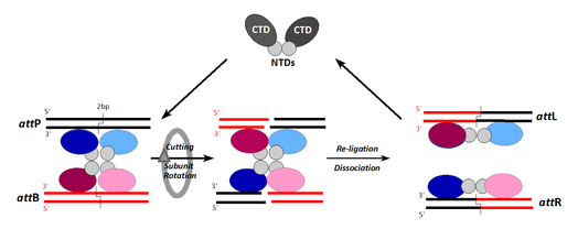 Since the initial discovery that recombinase can be used in genomic engineering,24 the recombinase-mediated cassette exchange, one of the technology in the field of reverse genetics, is of increasing relevance.25 To effectively resolve complex labDNA insertion, and to avoid epigenetic influence, site-specific recombination technology enters the field. Site-specific recombinase are grouped into two families: the tyrosine recombinase (such as Cre, Flp), and serine recombinase (Tn3 resolvase, фC31, Bxb1, R4 integrase). One of the best examples is the фC31 integrase in mice.26 In their experiment, фC31 integrase (Figure 1) were used to catalyze recombination between one or two attB sites in a labDNA with one or more tandem attP sites that they previously inserted into specific loci in mice bioDNA. Via pronuclear injection Tasić et al.27 received single-copy insert into predetermined chromosomal loci with high efficiency (up to 40%).
