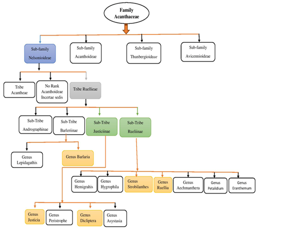 The family is known for a wide variety of its tropical and subtropical habitats. Some species are found in temperate regions.4 The four main regions of its distribution are Malaysia and Indonesia, Brazil, Africa and Central America. Justicia is the largest genus of Acanthaceae, with approximately 600 species, which are found in pantropical and tropical regions.8 The detailed information of some important genera of this family is given in Table 1 & Figure 1.