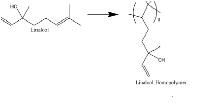 As such the product cannot be due to free radical propagation chain reaction on linalool (typical polymers made via classical free radical polymerization) since such a product would not have C=O and in the propagation step of polymerization at least there would be addition of the propagating radical to one of the –C=C– which turn it into –CHR-CH2– (which means addition of methylene groups) although in many cases both C=C bonds would turn into –CHR-CH2– and the product would have a large fraction of methylene groups. This means the number of C=C bonds decrease by a factor 2 at least and it could be as little as 0. (Figure 1) shows the poly-3,7-dimethyl-octene-poly-3ol polymer (Linalool Homopolymer) which is expected from bulk free radical polymerization of Linalool, when such polymerization can happen on one double bond.