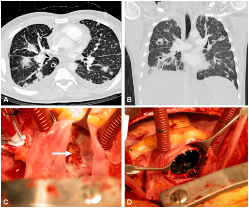 We report a 30-year-old male, intravenous drug abuser, referred with tricuspid valve endocarditis and bilateral multiple lung abscesses (Figure 1A) (Figure 1B). Over the preceding 2-months, he developed insidious symptoms of fatigue and dyspnoea. A transthoracic echocardiogram demonstrated severe tricuspid regurgitation and blood cultures grew methicillin sensitive Staphylococcus aureus. Initial treatment included combined broad-spectrum antibiotics. The pulmonary abscesses resolved following a period of microbial containment and pre-operative stabilization. He underwent a tricuspid valve replacement (Figure 1C) with a low profile 31mm mechanical prosthesis (ATS Open Pivot® Heart Valve, ATS Medical Inc, Minneapolis, USA) (Figure 1D). Following an uneventful postoperative course, the patient was discharged with endocarditis prophylaxis after 8 weeks and referred to a drugs rehabilitation facility. Three monthly follow-ups for 5years showed preserved bi-ventricular function with a functioning prosthesis at a constant mean gradient <3mmHg. During this period, the patient was free of narcotics and experienced no further pulmonary complications.