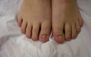 This syndrome is comprised of thick ridged hypoplastic nails which are very prone to paronychia, sparse brittle hair, hyperkeratosis (thick palms and soles), and dark skin over joints eg: knees and elbows, white patches inside the mouth especially the cheeks Figure 2. In addition to these features they can have thin or absent outer eyebrows, absent or reduced eyelashes. They have normal teeth and sweat and the intelligence is normal.1,4 Diagnosis/testing. HED2 is suspected after infancy on the basis of physical features in most affected individuals. GJB6 is the only gene known to be associated with HED2 Figure 3 it is possible to perform prenatal testing.2,3