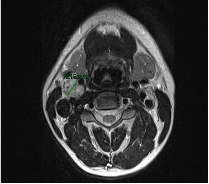 Figure 2 MRI of the patients neck showing large paraganglioma between internal and external carotid arteries.