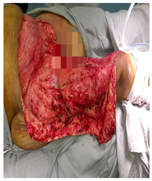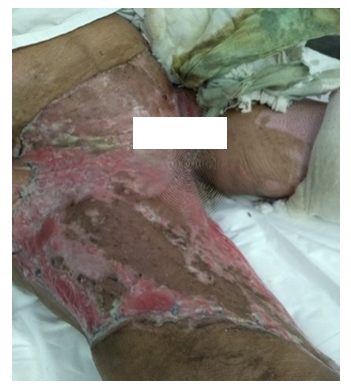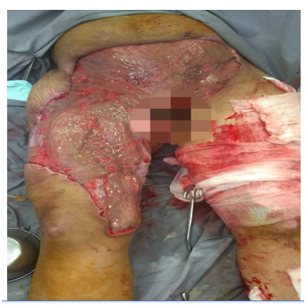 24 year old pregnant female patient presented to Emergency Room with history of road traffic accident bike versus trailer. On arrival she had tachycardia with heart rate of 111/min, BP 110/75mmHg, SpO2 99, RR18/min. On taking brief history she was gravida sixth 24weeks pregnant, with no known co morbid. Patient was assessed by general surgery, plastic surgery, orthopedic and obstetric team she was conscious oriented, with regular breathing pattern, and hemodynamically stable with severe pain recorded on Visual Analogue Scale as 8/10. She had inferior pubic rami fracture on X-Ray. E-FAST was negative. She was diagnosed with extensive degloving injury of lower abdomen involving lower abdomen and right thigh (Figure 1) Patient was resuscitated with fluids; multimodal analgesia was given to reduce pain and was shifted to high dependency unit. Multiple teams were involved including Orthopedic, Plastic, General surgery and Gyne Obs. All came on final decision for keeping the baby as it was healthy and viable and not causing immediate threat to mother life. Anesthetic management included arterial line in left radial artery, central line was passed in right internal jugular vein. Induction done with fentanyl, propofol and rocuronium. Standard monitoring done eg, ECG, pulse oximetry, invasive blood pressure, temperature and end tidal CO2 Serialdebridement with wound washouts were done combine by orthopedic and plastic surgery team, after 7 sessions of debridement VAC dessing was applied which was changed alternate days. After 25days of admission wound become healthy and granulating then plastic surgery took the decision of doing Split thickness skin graft (Figure 2). Patient develop pseudomonas graft infection (Figure 3), Inj. Imipenem was started. Patient responded to treatment. Patient was mobilized on 30th day after discussion with orthopedic about weight bearing.