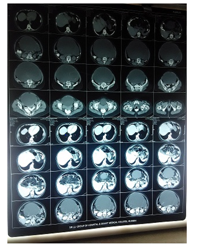 Systemic examination showed no abnormality in respiratory and cardiovascular system. Per abdominal examination revealed a huge mass arising from the pelvis corresponding to 36weeks of gestation extending from xiphisternum to pubic symphysis felt. It was solid to cystic in consistency with restricted mobility and no external ballotability (Figure 1). Per speculum examination revealed high up cervix. Per vaginal examination was suggestive of mass of 36weeks gestation size arising from pelvis which was solid to cystic in consistency with restricted mobility and bilateral forniceal fullness was present . Ultrasound examination was suggestive of large 33x28x21cm of left ovarian complex cyst with bilateral hydronephrosis. Uterus and right ovary and rest of abdominal organs were normal size. Computed Tomography scan showed large complex cystic mass of size 18.6cmx26.1cmx29.1cm with multiple septae within arising from pelvis extending into the abdomen displacing and pressing abdominal organs in vicinity like bowels, bladder, ureter, blood vessels etc. There were areas of septal calcifications within. Both ovaries were not seen separately (Figure 2). Contrast administration showed peripheral and septal wall enhancement. No solid enhancing component seen. All findings were suggestive of ovarian neoplasm likely benign in origin but needed confirmation by biochemical markers and histopathological examination.