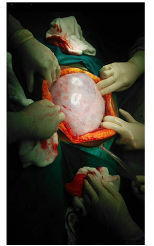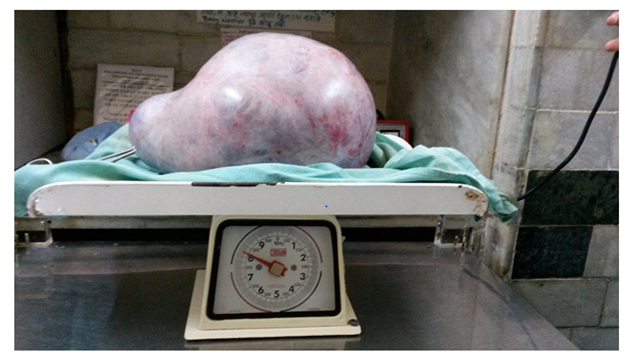 Exploratory laparotomy was done and In situ findings showed a large grayish white smooth mass of 30cmx25cmx25cm size huge tumour of ovary extending from pelvis reaching to xiphisternum (Figure 3) Solid to cystic in consistency, surface was smooth with restricted mobility. Ovarian mass was explored out, pedicles traced and dissection of ureter done, pedicles clamped and ovarian mass was excised and sent for frozen section which reported as mucinous cystadenoma of ovary. Total abdominal hysterectomy with right salpingoophorectomy done. On Gross tumour weighed to 8.5kg (Figure 4).