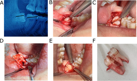 Figure 1 Proximal mesial impacted tooth extraction using two-line parallel split tooth method. A) Parallel lines design based on orthopantomography (OPT). B) Flap development and exposure of impacted tooth. C) tooth sectioning following the parallel lines using dental drill. D) Removal of distal part of the tooth. E) Removal of mesial part of the tooth. F) The impacted tooth.