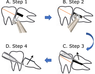 Figure 2 Flow chart for extraction of proximal mesial impacted teeth by the two-line parallel split-tooth method. A) Step 1: The cutting drill is first ground perpendicular to the tooth surface, along the drawn line towards the lingual side, to grind out a groove. B) Step 2: Adjusting the direction of the dental drill in the groove ground in the first step and grinding in the direction of the root bifurcation. C) Step 3: Inserting the dental elevator into the groove and rotating the dental elevator to split the tooth in half and removing the distal part firstly. D) Step 4: Removing the mesial part of the impacted tooth secondly.