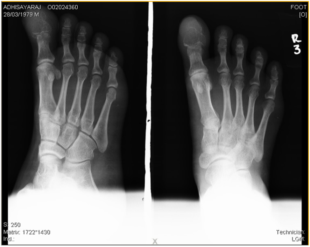 The standard treatment of this tumor has traditionally been intra lesional excision, aggressive curettage with or without bone grafting. The recurrence rates are high after this procedure. The recurrence of tumor has been reduced, by using chemical or physical means of inducing necrosis of any remaining neoplastic tissue. The other surgical option is en-bloc resection of involved bone segment. We choose the last option for this patient because of aggressive features of the lesion. Giant cell tumour involving the phalanx in foot is very rare. These are aggressively growing tumors. Giant cell tumor in such a location need regular follow to detect local recurrence (Figure 1).