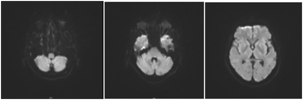 Figure 2 MRA/MRI Brain: Likely acute infarcts in the left cerebellum, occipital lobe, include the left longitudinal fasciculus which would account for the patient’s symptoms.