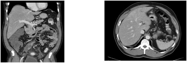 The CT thorax and CT pulmonary angiogram showed marked pulmonary infiltrates and thrombi. There was a thombus in the segmental right lower lobar pulmonary area, with an infracted region in the right lung base. There was also another thrombus in the anterior segmental branch of the left lower lobe pulmonary artery. Subsequently, the patient suffered from opthalmoplegia due to stroke in the ward. The MRI/MRA revealed acute infarcts in the left cerebellum, occipital lobe and left medial longitudinal fasciculus. He also developed gut vasculitis and a perforated transverse colon (Figure 3) (Figure 4). The findings on CT abdomen and pelvis were consistent with that of a small/medium vessel vasculitis. Multifocal ischemic colitis was seen involving the right lateral and posterior walls of the rectum as well as the inferior wall of the mid transverse colon with suggestion of perforation on both sides. The superior rectal artery was thrombosed as well. The patient then underwent emergency laparotomy with resection of small bowel and stoma creation. Post-operatively recovered well and was discharged two weeks after. Currently he is on follow up with rheumatologist, neuroopthalmologist and general surgeon (Figure 5).
