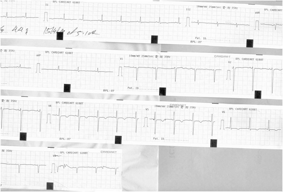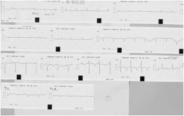 Her ECG showed her rate was 85/minute, her PR interval was 12sec and her QRS duration was 0.1sec. Her QT interval was 44second. (She had QT prolongation) (Her QTc was 655msecs)She also had T inversion in the lateral leads (Figures 1) (Figure 2). Figure 2 shows how her QT interval shortened with correction of her calcium level to 8.0mg/dl (QTc 492msecs).