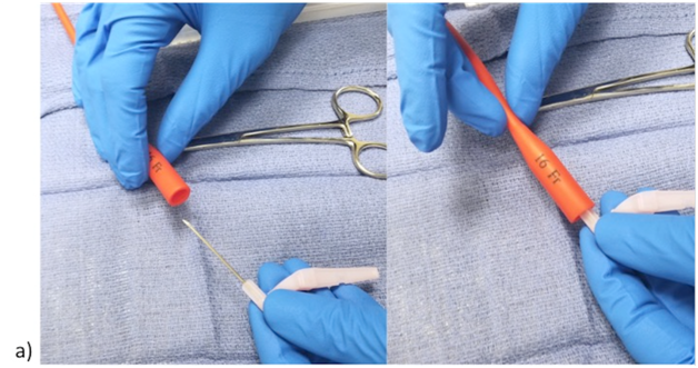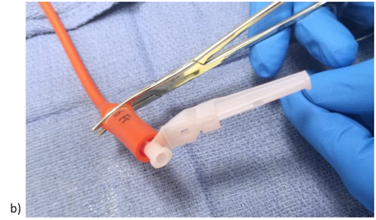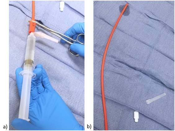 A few items are required for this technique. These items are as follows: 18-gauge needle (Smiths Medical, Dublin, OH, U.S.A) (preferably a blunt tip Luer Lock needle) or stiff catheter, a curved or straight Kelley clamp (Cardinal Health, Dublin, OH, U.S.A), and a normal saline flush (BD, Franklin Lakes, NJ, U.S.A) (Figure 1). This technique comprises of a few simple steps. The first step is to insert the 18-gauge needle or stiff catheter into the feeding tube, taking care not to perforate the wall of the tube, if using a sharp tip needle (Figure 2a). The next step is to apply the Kelley clamp around the feeding tube and on top of the needle, such that the tube is completely collapsed around the patent needle (Figure 2b). Then attach a saline flush syringe to the needle and start injecting gently to feel for resistance (Figure 3a). Once resistance is felt, apply a gradual increase in pressure until the resistance is relieved and saline flows freely through the opposite end of the tube (Figure 3b). At times it may be necessary to agitate the saline within the tube to clear the obstruction, which can be achieved by rapidly alternating gentle injection and release of pressure. It is important to stabilize the needle and tube in one hand and inject with the other in order to prevent puncture of the tube. Once the resistance is cleared, an additional water or saline flush can be used to flush the tube, after unclamping and removing the needle from the tube.