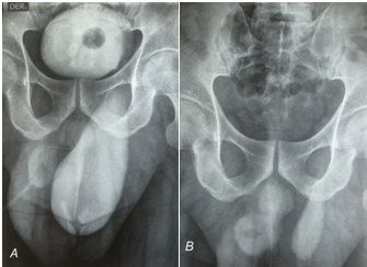 Renal, bladder, inguinal and testicular ultrasounds were practiced and reported: Bladder displacement by left inguinal canal and scrotum. Both kidneys, ureters and testis with normal characteristics. For the high suspect of urinary bladder as the acute renal failure origin a retrograde cystogram was scheduled, finding in filling plate contrast material in urine bladder with 90% displacement to the scrotum by left inguinal canal (Figure 1A). In post voiding projection residual urine is observed in left scrotum (Figure 1B).