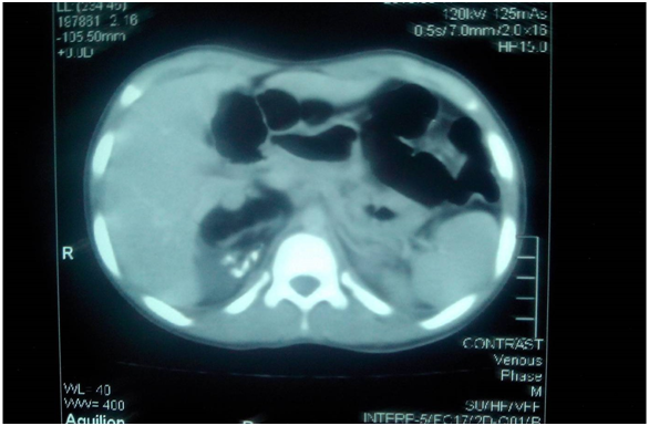 An 11years old boy, a known case of Down’s syndrome, presented with localized and intermittent pain in right lumbar region for one year. There was no history of fever, weight loss, burning micturition, hematuria or any previous surgical intervention. Patient was a product of consanguineous marriage. On examination, the abdomen was soft, non-tender, non-distended and with no palpable mass. The Ultrasound revealed a 4x3.5x5cm predominantly echogenic mass with calcification and cystic area in the right suprarenal region, compressing the right kidney inferiorly. All the baseline investigations were unremarkable. Echocardiography showed dysplastic pulmonary valve with mild pulmonary stenosis. Alpha feto protein was 0.654IU/ml (reference range<5.0). The child was also found to be having positive Hepatitis C status. Computed Tomography (CT) scan was obtained which showed a suprarenal mass (Figure 1-2). The patient was discussed in tumor board and was shifted to the department of pediatric surgery with the suspicion of right adrenal teratoma. Patient was optimized and surgery was planned. The tumor was surgically excised, yielding a 7x5x5cm grey colored mass. Grossly, it appeared cystic with clear serous fluid oozing out on cutting. On microscopic examination it was a cyst without any lining, lumen having hemorrhage along with scattered hemosiderin laden macrophages. Wall of the cyst revealed sheaths of hemosiderin laden macrophages with underlying lymphoid tissue, scattered smooth muscle bundles and foci of adipose tissue. There was focal calcification and a single focus of cartilage along with skeletal muscle and nerve bundles, so diagnosis of Adrenal Teratoma was made. The post-operative period was uneventful and patient is doing well to date after a follow up of 2 years.