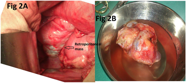 Teratoma is suggested to be derived from germ cells as per the parthenogenic theory. They may be mature; with developed tissue and predominantly benign nature or immature having embryonic tissue and susceptibility of malignancy. Infrequently, mature teratoma may undergo malignant changes.2 Adrenal teratoma is a rare type of retroperitoneal teratoma that is usually symptomless. But they may present with pressure effects, or acutely, with torsion or rupture of tumor. When symptomatic, adrenal teratoma tend to be misdiagnosed as adrenal neoplasm.3,4 They may also guise as an ovarian cancer, renal cyst, retroperitoneal fibroma, sarcoma, cystic neuroblastoma, etc.4 Adrenal teratoma, unlike gonadal variety have a greater prevalence in males with a ratio of 1:1.2 and a left side propensity.1 Our case on the other hand had a right sided teratoma. Some association between the retroperitoneal teratoma and Down’s syndrome is also being reflected upon, in the literature.5 However, there is no ample proof on the subject to help establish such a connection. Typically teratomas are diagnosed incidentally, on radiological examination. Suspected teratoma should be checked for any hormonal activity or malignant proclivity. Complete excision of the neoplasm is an effective treatment. Nonetheless, if malignant, adjuvant therapy in the form of radiation and chemotherapy is indicated. Although, a retroperitoneal teratoma is very rare, it may be included in the differentials of retroperitoneal masses. Moreover, the likely malignant potential of these confounding neoplasms implore us for their timely diagnosis and hence, the treatment.5 Rare masses have a tendency to deceive us to misdiagnose the case, therefore they need to be considered while approaching an unusual case. Moreover, the association of down syndrome with retroperitoneal teratomas, if present, needs to be associated.