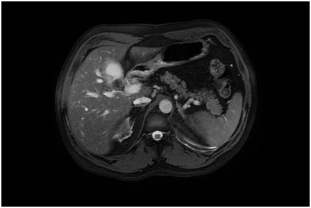 A 51-year-old Caucasian male presented to our emergency department with yellow skin, eyes and light colored stools which had developed over 2-3days along with some loss of appetite & weight. He was not complaining of any pain or change in his bowel or bladder habits. There was no associated fever, pain in the abdomen, nausea/vomiting or pruritus. His past medical history was significant for Diabetes Mellitus and Hyperlipidemia, which were being managed medically. The patient only admitted to occasional social drinking. Labs revealed an Obstructive Jaundice pattern with direct hyperbilirubinemia and elevated liver enzymes. Previous records showed normal LFTs despite statin therapy for Hyperlipidemia. US abdomen showed presence of gallstones and GB sludge. CT Abdomen done in the emergency room showed multiple calcified gallstones within the Gall Bladder and a large gallstone at the neck of the Gall Bladder (Figure 1). There was also mild intrahepatic biliary ductal dilatation noted in the CT scan. The hepatitis panel was non-reactive for Hep A, B and C, ANA was negative and SMA was 1:20. Further labs revealed an elevated CA 19-9 level. Working diagnosis at this time involved choledocholithiasis with autoimmune etiology vs Mirizzi syndrome MRCP showed a large GB stone within the neck of the gall bladder with asymmetric biliary ductal dilatation. MRI abdomen (Figure 2) confirmed the GB neck gallstone and showed the stone exerting the mass effect on the adjacent CBD contributing to the dilatation of the intrahepatic biliary system superior to the level of the obstruction consistent with Mirizzi syndrome type I.