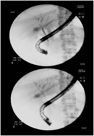 Emergent ERCP (Figure 3) was done and findings were consistent with the Mirizzi syndrome type I and also showed a biliary stricture in the distal right intrahepatic system extending to the common hepatic duct. The right intrahepatic system was stented at the level of the right intrahepatic and there was dilatation noted on the left side. The patient underwent a follow up cholecystectomy during which intraoperative findings showed an edematous & non-gangrenous GB. The cholecystectomy specimens and the biopsy of the CBD strictures were sent to pathology for histo-pathological correlation.