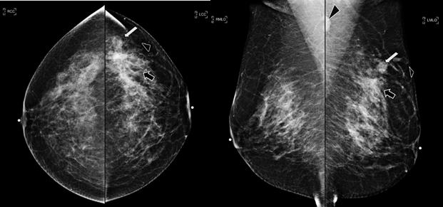 Figure 1 Craneocaudal and Mediolateral Oblique projections. The breast tissue is the heterogeneously dense (category “C” of the American College of Radiology, 2013). In the left breast, exists a focal asymmetry associated with residual cluster of amorphous microcalcifications and architectural distortion, localized in the middle third of the upper outer quadrant, that coincides with the site of the biopsy (black arrow). Adjacent to these findings, at the superior region, a new nodule is observed (white arrow). This nodule is isodense, round and with microlobulated margins, which corresponds to the palpable area which is signaling by radiolucent triangular tissue marker. In the ipsilateral axillary region, an anormal lymph node is seen (head arrow).
