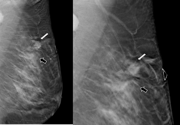 Figure 3 Digital breast tomosynthesis (DBT) in MLO projection. The margins of the nodule are well defined (white arrow) and the architectural distortion is confirmed (black arrow).