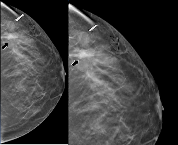 Figure 4 Digital breast tomosynthesis (DBT) in CC projection. The margins of the nodule are well defined (white arrow) and the architectural distortion is confirmed (black arrow).