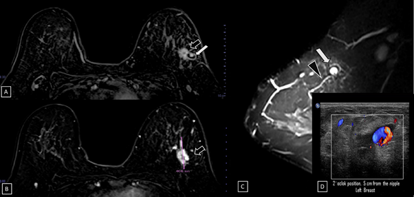 The hematoma is seen on mammography like a focal asymmetry. The hematoma does not appear as an oval or irregular mass and tends to calcify. In the acute phase, the ultrasound reveals a hyperechoic collection that becomes a complex nodule with solid and cyst areas. Using Doppler color there is absence of vascularity of the mass. Subsequently, the hematoma completely disappears or degenerates into fat necrosis. On MRI, at the early phase it is hyperintense on T1-sequence, hypointense on T2-sequence and does not show enhancement.10 Arteriovenous fistula (AV) has a large nutrient artery and a large vein. A-V fistula is presented as pulsatile hematoma with audible murmurs. Using color and spectral Doppler, the venous and arterial flow pattern confirm the diagnosis.21
