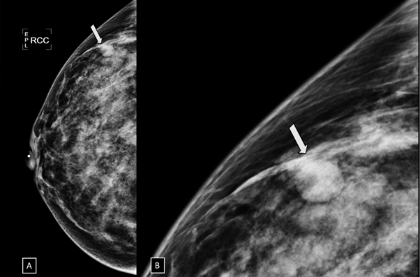 Figure 7 A) Craniocaudal and B) electronic magnification projections. A round, isodense and circumscribed nodule (arrow) is found in the anterior third of the outer quadrant of the right breast.